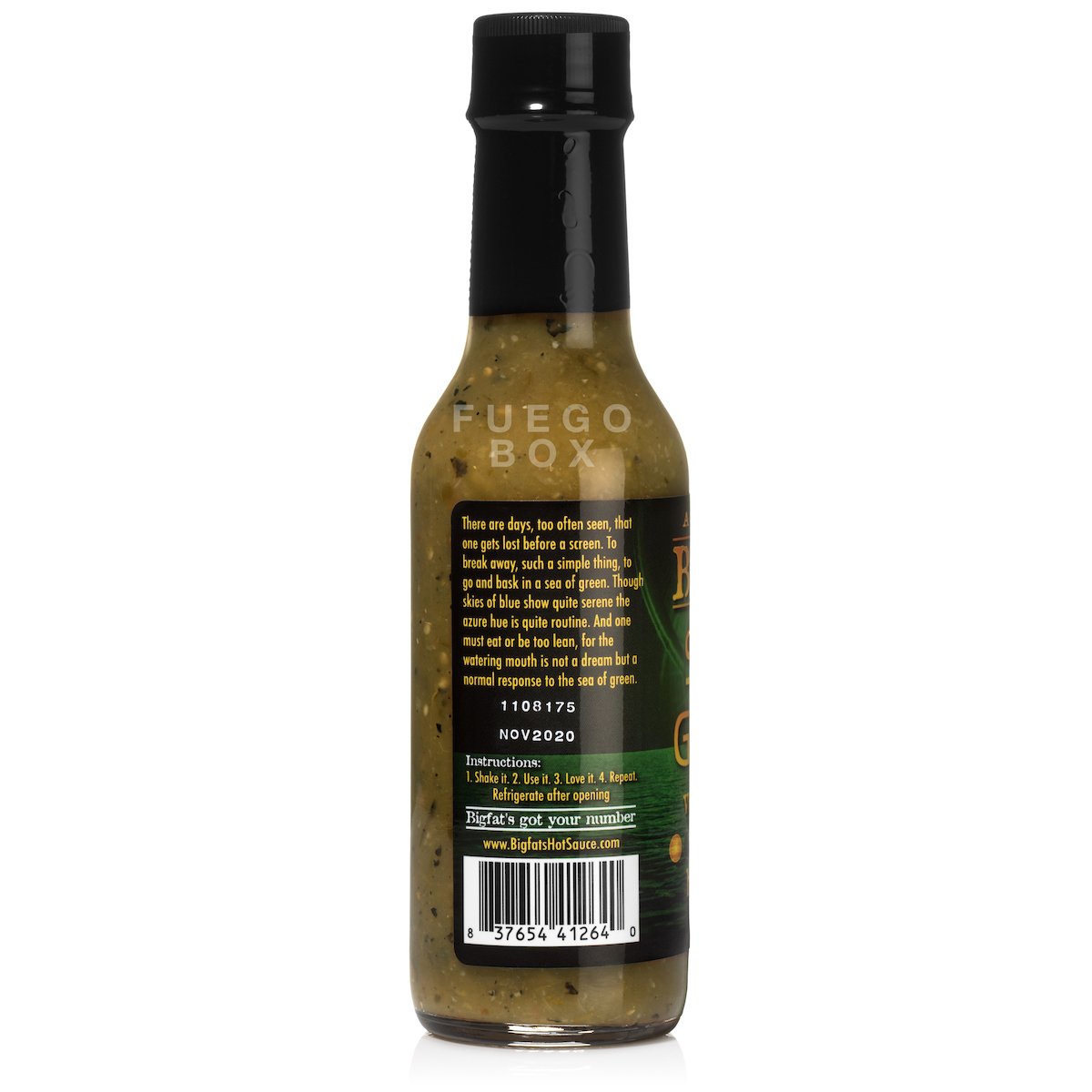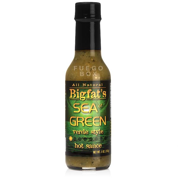 A favorite at Fuego Box's Los Angeles Hot Sauce Store, Bigfat's verde style hot sauce comes to life with tasty roasted tomatillos and rich poblano peppers. The habanero bite is complemented by fresh garlic, tangy lime juice, and cilantro. Once you dive in, your taste buds will be happily swimming in a Sea of Green.