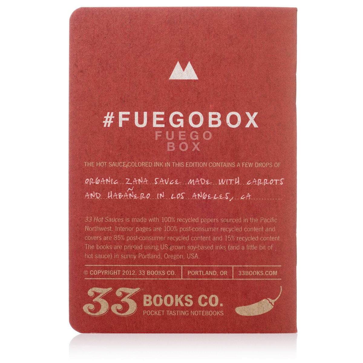 "Our Hot Sauce Log is pocket-sized hot sauce journal designed for ease of use. It's tough to hold a notepad in one hand, a pencil in the other, and have another hand left for a taco. Taking notes with our log is as simple as checking a few boxes and entering a few basic facts. Oh BTW, a teeny, tiny amount of Zana Hot Sauce is added in the ink during the printing process! Made at a small printing shop in the Pacific Northwest from 100% recycled paper.