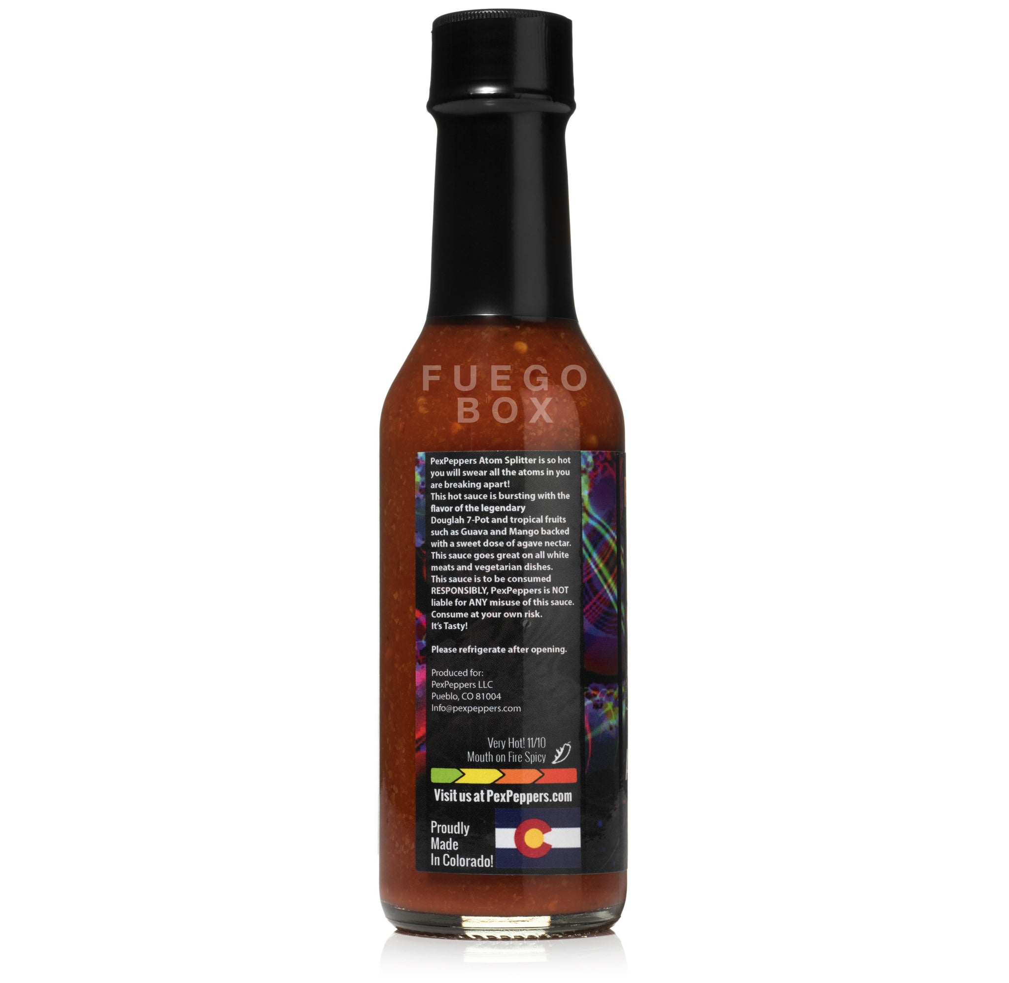 PexPeppers Atom Splitter is up there with the hottest all natural sauces we’ve ever tasted at Fuego Box. In this sauce, Pex Peppers utilizes the mighty 7 Pot Douglah chile from Trinidad combined with fresh mango and guava. The 7 Pot Douglah is also known as the Chocolate 7 Pot chile and has a very unique, almost radiating type of burn; there’s a reason it’s one of the top 5 hottest peppers in the world. Try a little at first to see if you can handle the heat.