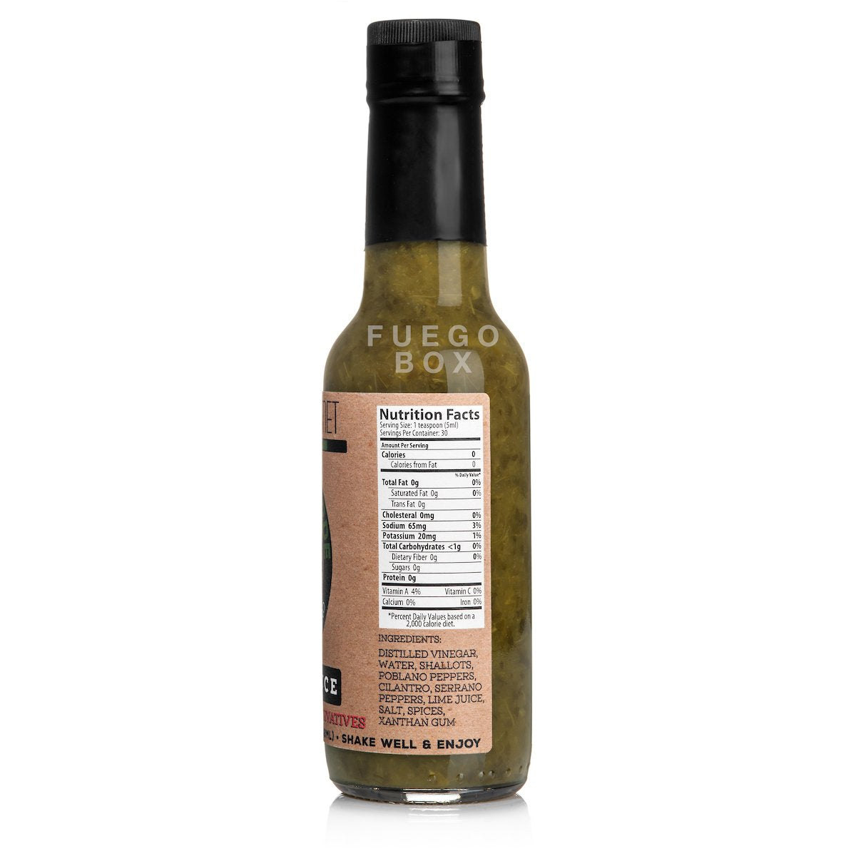 Distilled Vinegar, Water, Shallots, Poblano Peppers, Cilantro, Serrano Peppers, Lime Juice, Salt, Spices, Xanthin Gum.