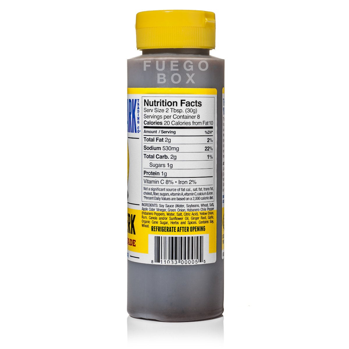 Soy Sauce (Water, Soybeans, Wheat, Salt) Apple Cider Vinegar, Green Onion, Habanero Chili Pepper (Habanero Peppers, Water, Salt, Citric Acid) Yellow Onion, Rum, Canola and.or Sunflower oil, Ginger Root, Garlic, Organic Cane Sugar, Herbs, and Spices.